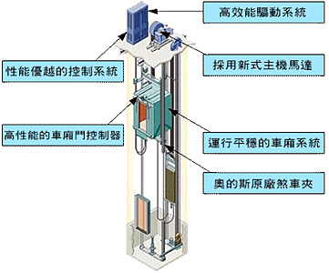 電梯控制系統由數個子系統構成,各種周邊資訊在各個系統經過運算和處理之後,經由高速通信網路互相連結,使得電梯的運作能達到最高的效能和最大的彈性,產品的涵蓋範圍包含到最高速度150公尺/分的各種載重。